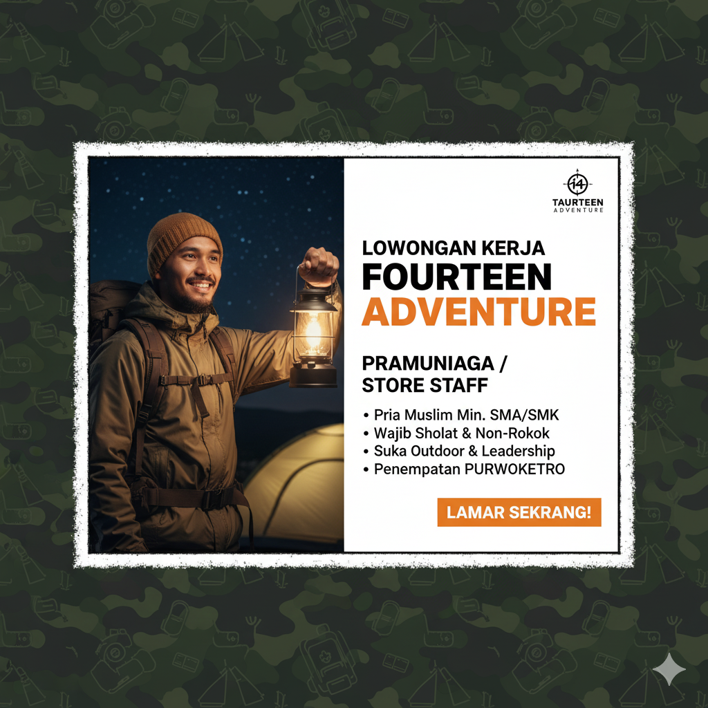 Fourteen Adventure, toko dan rental alat *camping* terlengkap dan terpercaya di Purwokerto sejak tahun 2012, membuka peluang karir bagi Anda yang memiliki minat tinggi di dunia *outdoor* dan petualangan. Kami mencari individu yang amanah, pekerja keras, dan memiliki jiwa kepemimpinan untuk posisi **Pramuniaga / Store Staff**.